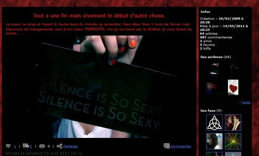 Dans les commentaires en réponse à mes articles Skyblog on trouve des commentaires de mes amix, reconnaissables par leur propres noms de Skyblog, où on peut retrouver leur propre autofiction, un nombre incroyable de commentaires anonymes (vraiment cela me surprend, mais parce qu'aujourd'hui ce n'est plus possible, ne peuvent laisser des commentaires que des personnes rattachées à un compte, même si le compte est anonymisé, il existe) et un certain L.. Je crois, dans les gros traits, qu'à l'époque j'avais 15 ans, lui 40, et on s'écrivait par commentaire, moi sur son blog, lui sur le mien. On répondait toujours à l'article, mais aussi au dernier commentaire qu'avait laissé l'autre. J'ai constaté en fouillant, que L. a mis à jour son blog pour la dernière fois en avril 2022. Cette correspondance immatérielle a eu un fort impact sur mon écriture, il fallait que je fasse le poids face à un adulte, et certaines expressions écrites, encore aujourd'hui, lui sont directement empruntées.